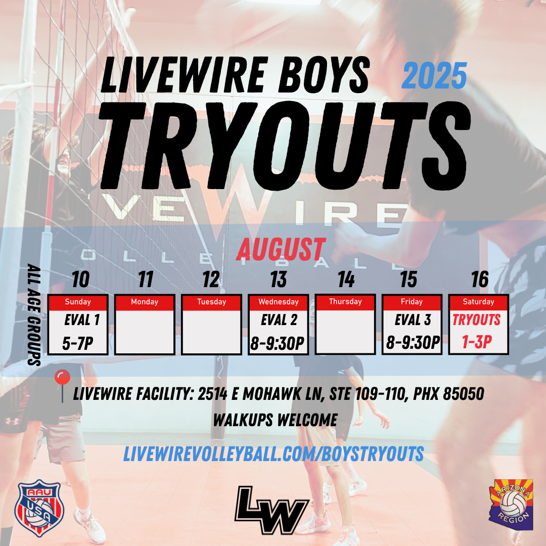 The Arizona Region allows clubs to host a maximum of 3 Pre-Tryout Evaluation Clinics per age group during the 10 day Open House Period. These eval clinics are an opportunity to learn more about LIVEWIRE, view our 3 court facility, meet and train with our coaches, and determine if you'd like to tryout at LW.